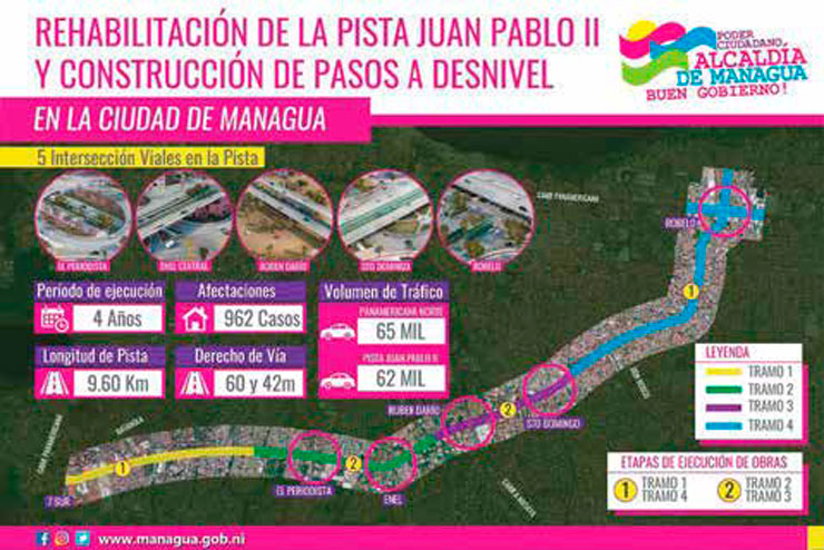 La obra atraviesa 33 barrios, por donde circulan 400 buses diarios que hacen uso unos 250 mil usuarios. Asimismo, por ese sector se desplazan unas 750 mil personas y más de 150 mil vehículos particulares. La inversión total de la obra es de 290 millones de dólares financiados por el gobierno de Nicaragua y el Banco Centroamericano de Integración Económica (BCIE).